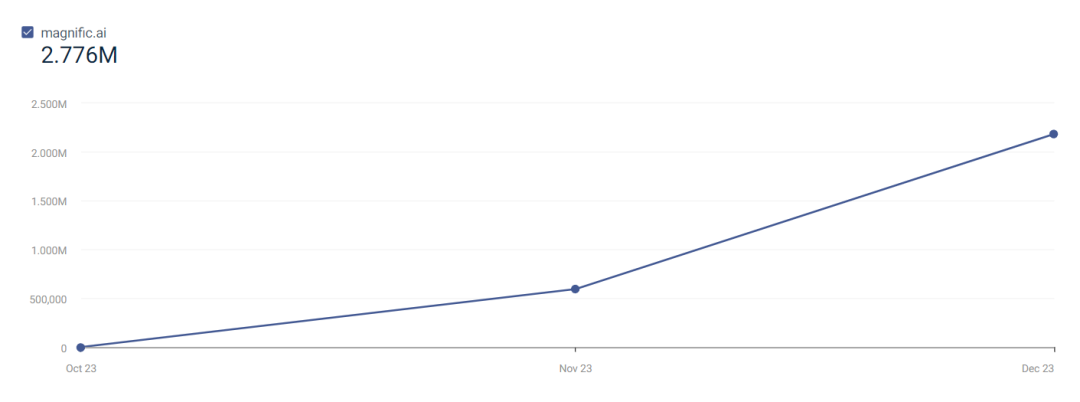 因功能强大,该网站引来许多AI工具爱好者付费试用,其用例在社交媒体传播后,也让Magnific AI逐渐热门起来。据Similarweb数据,Magnific AI网站访问量在2023年12月已达到220万人次,3个月访问量累计约277.6万人次。