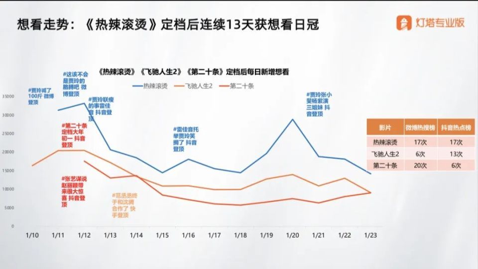 从宣传期的数据来看,根据灯塔专业版的数据,想看人数,《热辣滚烫》领先,《飞驰人生2》和《第二十条》紧随其后。