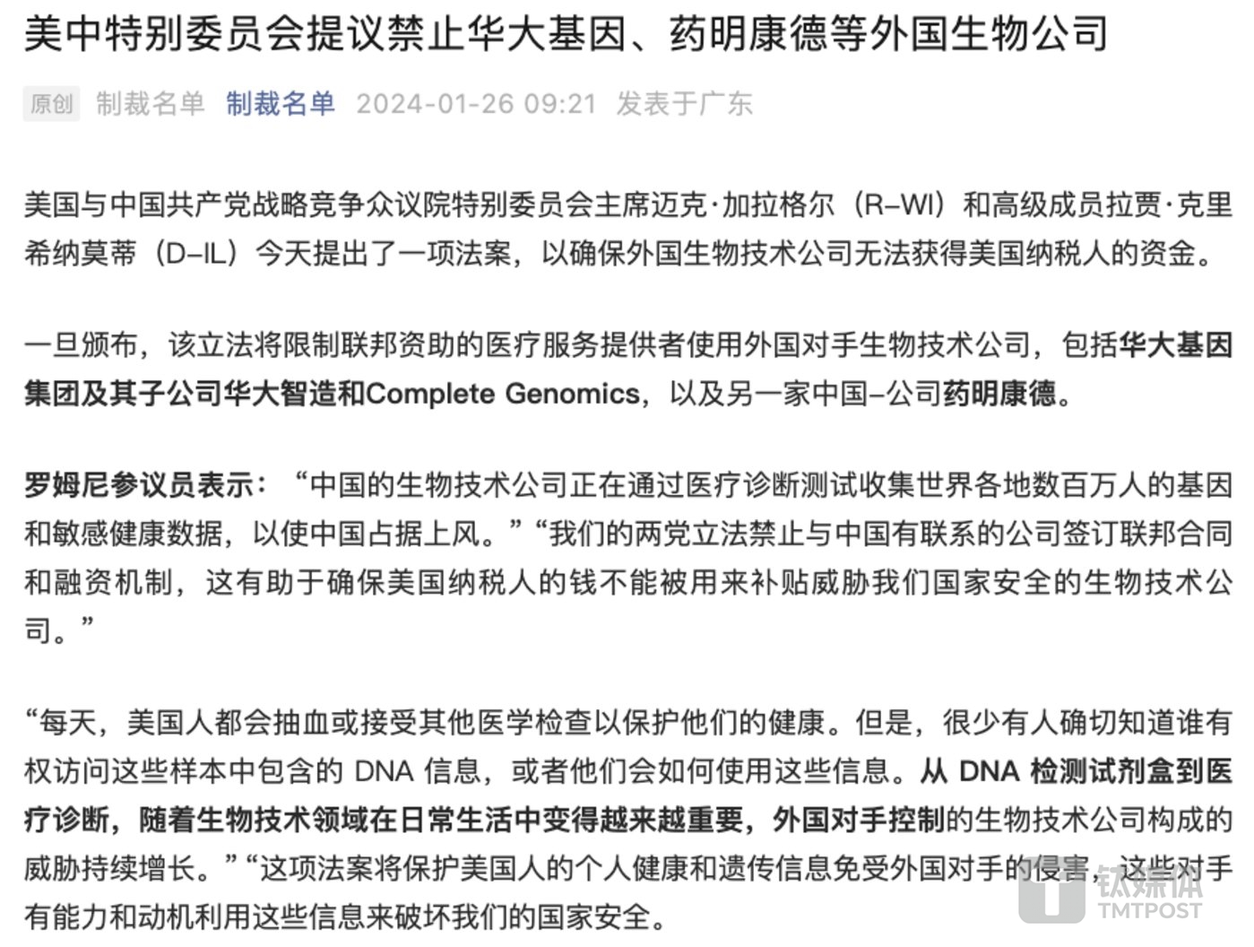 法案一旦通过,将限制联邦政府资助的医疗机构使用外国对手生物技术公司。其中提及的公司包括药明康德、药明生物、华大基因(300676.SZ)、华大智造(688114.SH)和Complete Genomics。
