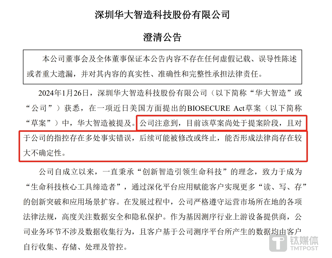 作为本次事件的另一当事方,华大智造亦于1月28日下午发布公告回应称,公司注意到,目前该草案尚处于提案阶段,且对于公司的指控存在多处事实错误,后续可能被修改或终止,能否形成法律尚存在较大不确定性。