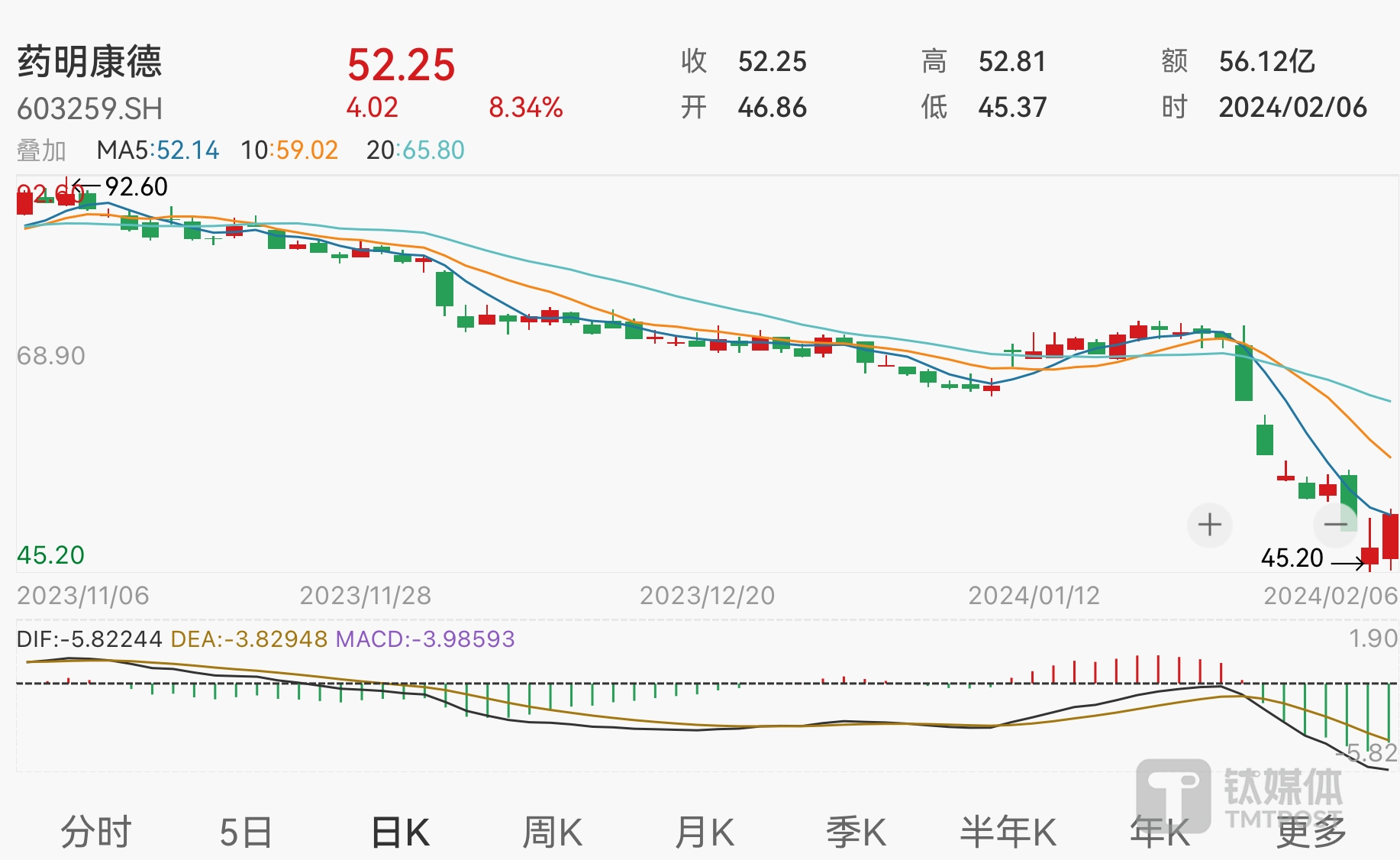 火速完成回购后,药明康德股价迎来大涨,截至2月6日收盘,药明康德报收52.25元,涨8.34%。而在此前,药明康德股价自1月26日起连续大跌,至2月5日盘中低值,其累计跌幅一度接近40%。
