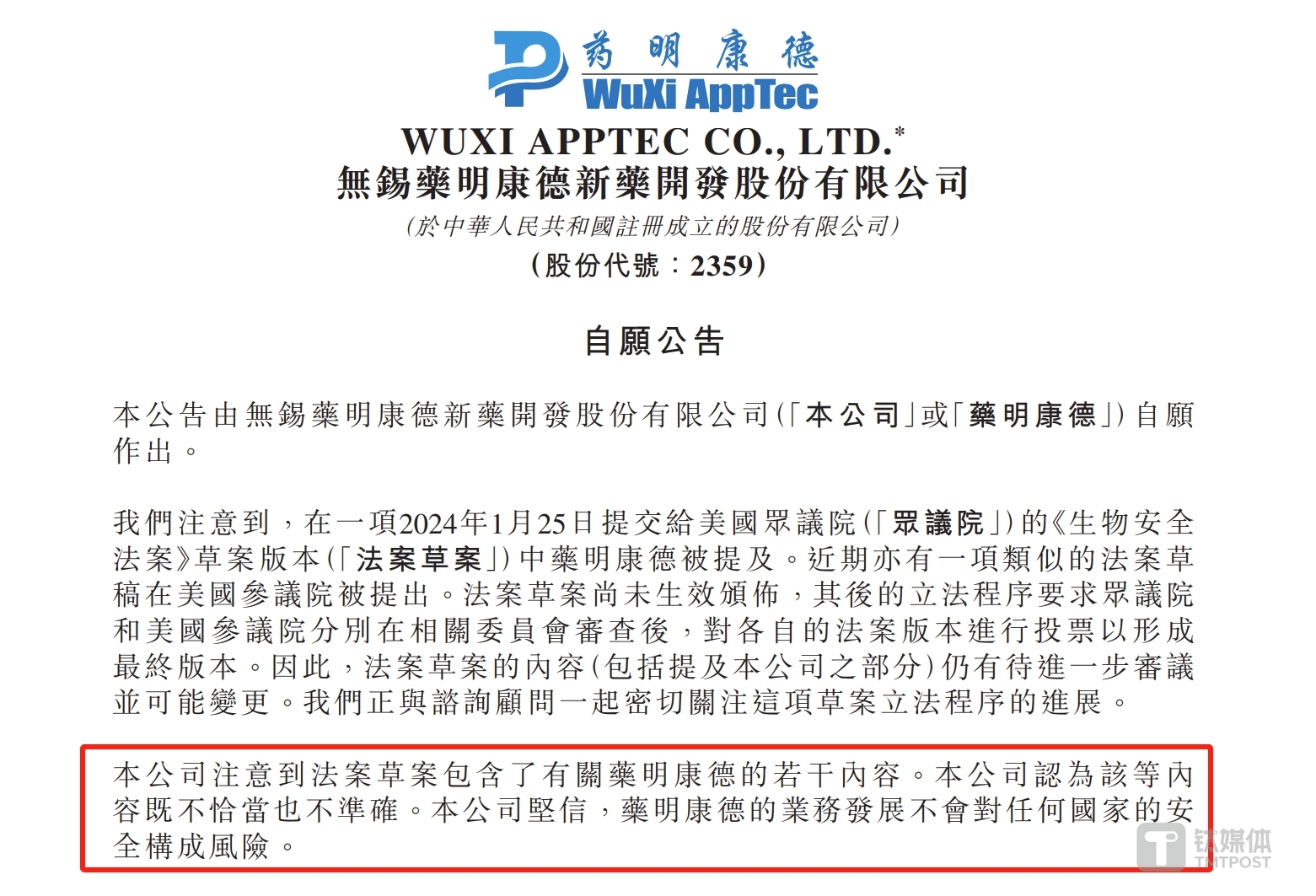 当日晚间,药明康德发布澄清公告称,公司注意到,在一项2024年1月25日提交给美国众议院的《生物安全法案》草案版本中药明康德被提及,近期亦有一项类似的法案草案在美国参议院被提出。