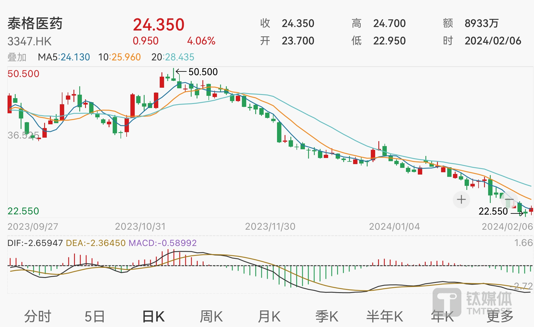 二级市场方面,截至2月6日港股收盘,泰格医药股价报收24.35港元,涨4.06%,成交额为8933.37万港元,当前公司总市值约212.43亿港元。