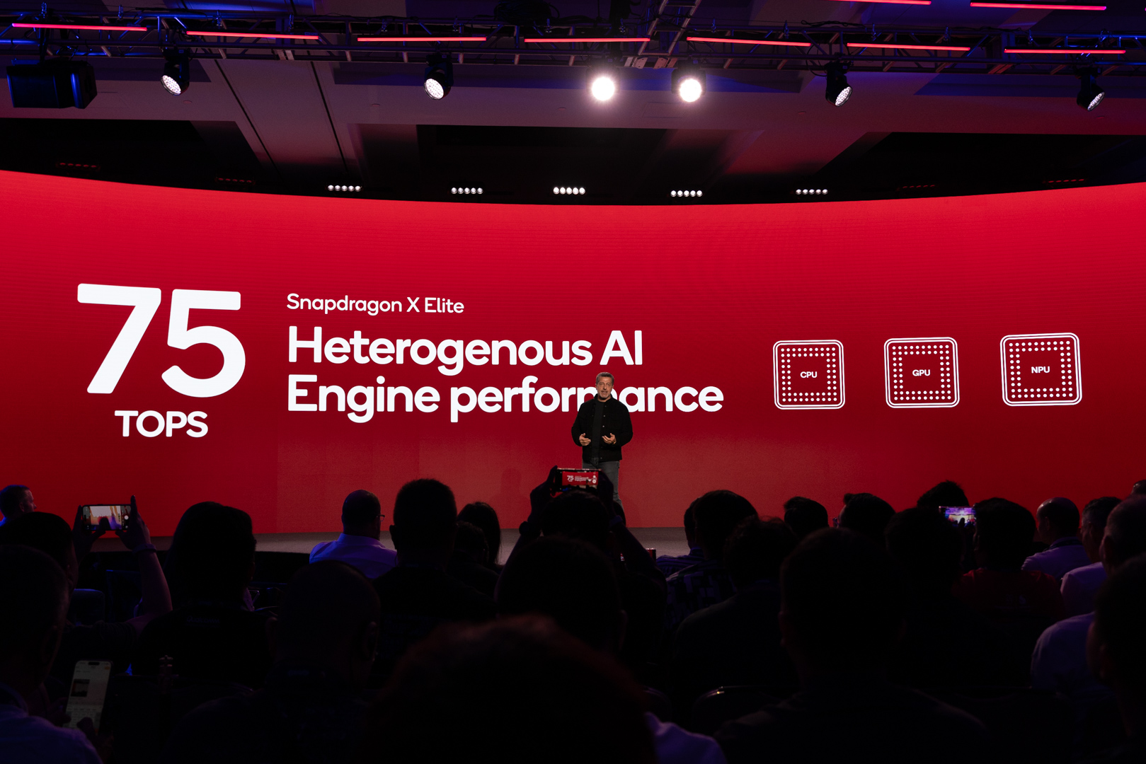 除了全新自研的 Oryon CPU,新架构也带来了骁龙 X Elite 在 AI 算力上全面升级,不仅是 CPU+GPU+NPU 的异构计算,还在于 NPU 本身性能的提升,最终在骁龙 X Elite 具备 75 TOPS 的算力规模。