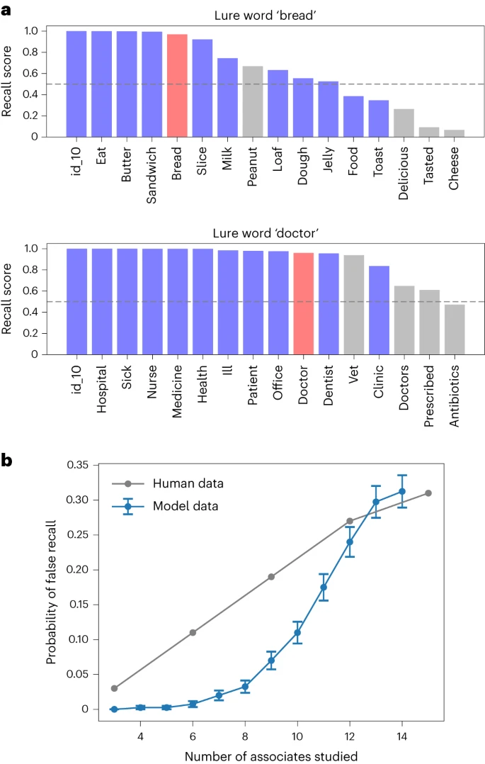 心理学研究发现,人们有时会错误地认为自己听到的故事包含了未曾出现的单词,而这仅仅是由于该单词与刚刚讲述的故事主题相关。这是记忆在重构过程中经由已有模式产生扭曲的另一个实例。图7展示的实验说明了这样的现象,并指出无论是人还是AI模型,都出现了这一现象。这让人想起大模型的幻觉,虽然两者有着不同的记忆机制,却有着相似的特征(缺陷)。