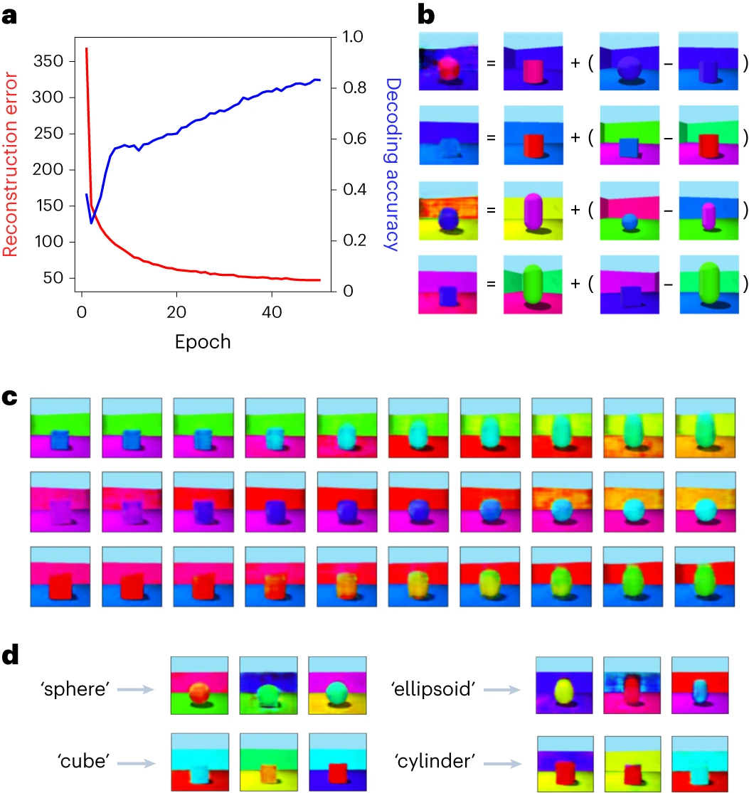 而为了验证上述架构是否能够拆解感官从而进行推理,研究者设计了如图3b中的题目。而前述的人工神经网络能够经由训练(图3a),完成对新概念的解码,并在记忆中对元素进行组合(这被称为想象,对应图3c中的图像)。此外,这些模型还能超越个别经验,利用共同的抽象特征通过同一生成网络处理不同的记忆(图3d)。这说明该模型已经学习了数据的一些概念结构,支持“A和B有特定关系,那么类似的,C与X有对应关系吗?”这类推理任务,并为记忆的灵活重组提供了一个模型,而这被认为是情境思维(类比)的基础。