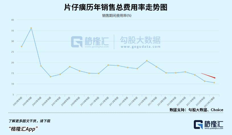 2017年至2023Q3,销售费用率从11.9%下降至4.98%,管理费用率从7.32%下降至5.8%,财务费用率则变化不大。加上研发费用率的四费,最新为10.6%,较2017年大幅下滑7.47%,较2003年上市时下滑16.9%。