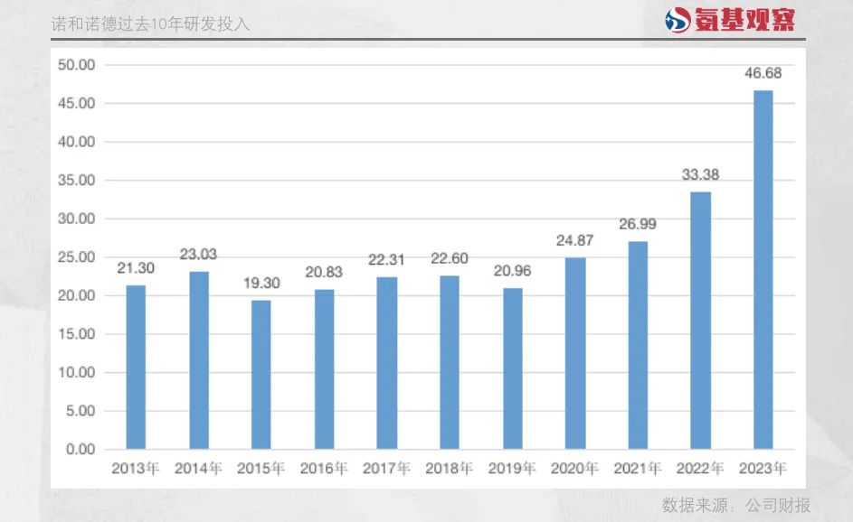 诺和诺德是最好的对比。虽然司美格鲁肽眼下成为药王的强有力角逐者,但诺和诺德的研发投入一直并不高。2013年以来,其研发总投入282.25亿美元,不及默沙东去年一年的投入。