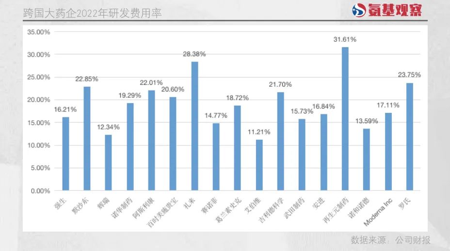 正常情况下,一家药企的研发费用会与营业收入相匹配。如下图所示,老牌跨国大药企的研发费用率,通常介于15%上下。