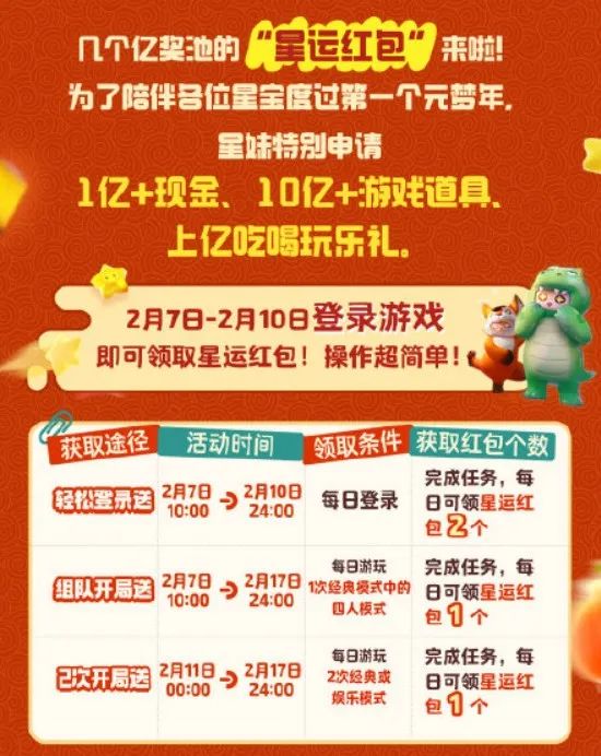新春活动上,这边《蛋仔派对》集卡做任务拉队友分1亿,轻松获得8.8元,那边《元梦之星》就拆红包抢1亿,还标明“超低门槛”,最高获得188元。