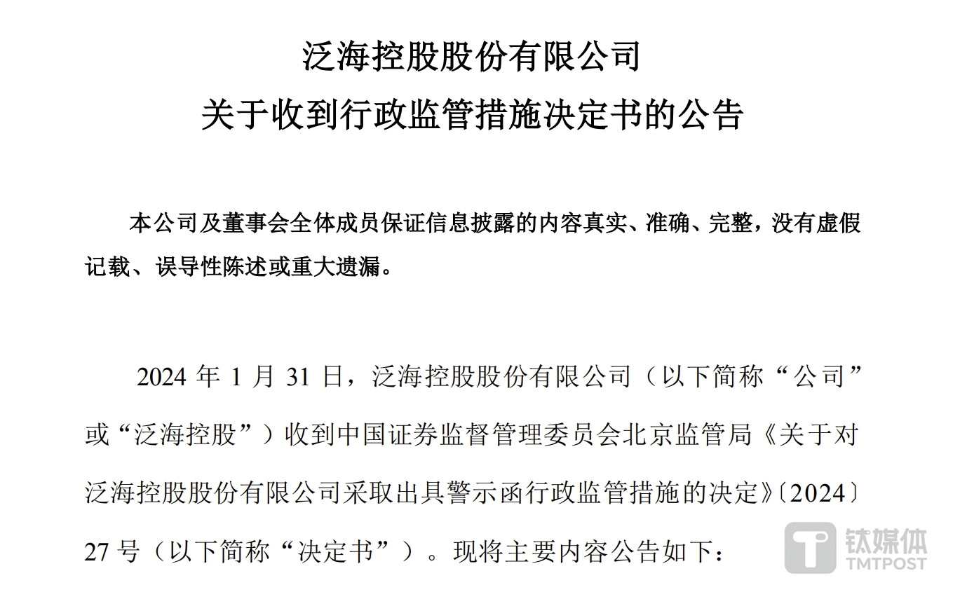 值得注意的是,在上述公告披露的前一日(2月5日),*ST泛海曾发布公告称,因涉嫌信息披露违法违规,公司收到中国证监会出具的《立案告知书》。根据相关法律法规,1月26日,证监会决定对公司立案。