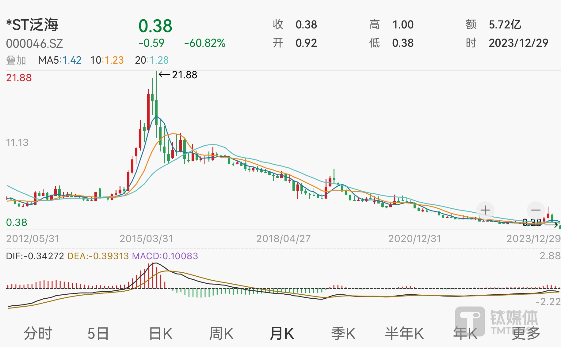 在停牌前,公司的股价已下跌至0.38元,彼时的总市值约19.7亿元。截至去年12月8日,*ST泛海的股东总户数约为8.03万户。