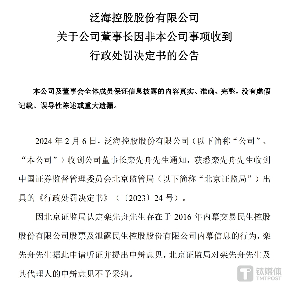 2月6日晚间,*ST泛海还发布公告,当天收到公司董事长栾先舟通知,获悉栾先舟收到北京证监局出具的《行政处罚决定书》。因北京证监局认定栾先舟存在于2016年内幕交易民生控股股份有限公司股票及泄露民生控股股份有限公司内幕信息的行为,栾先舟据此申请听证并提出申辩意见,北京证监局对栾先舟及其代理人的申辩意见不予采纳。