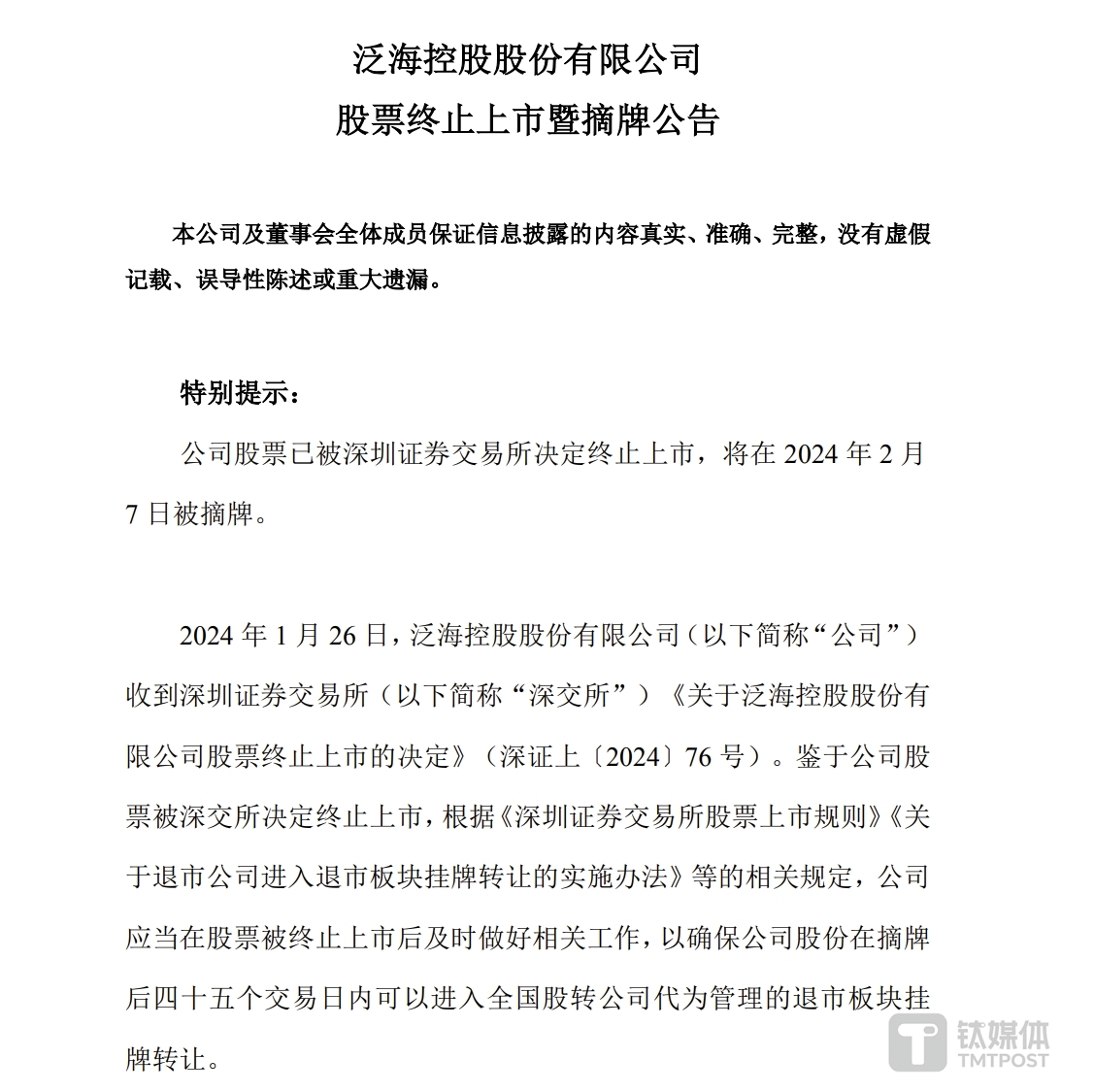 2月6日晚间,*ST泛海(000046.SZ)发布公告称,公司股票已被深交所决定终止上市,将于2月7日正式摘牌。