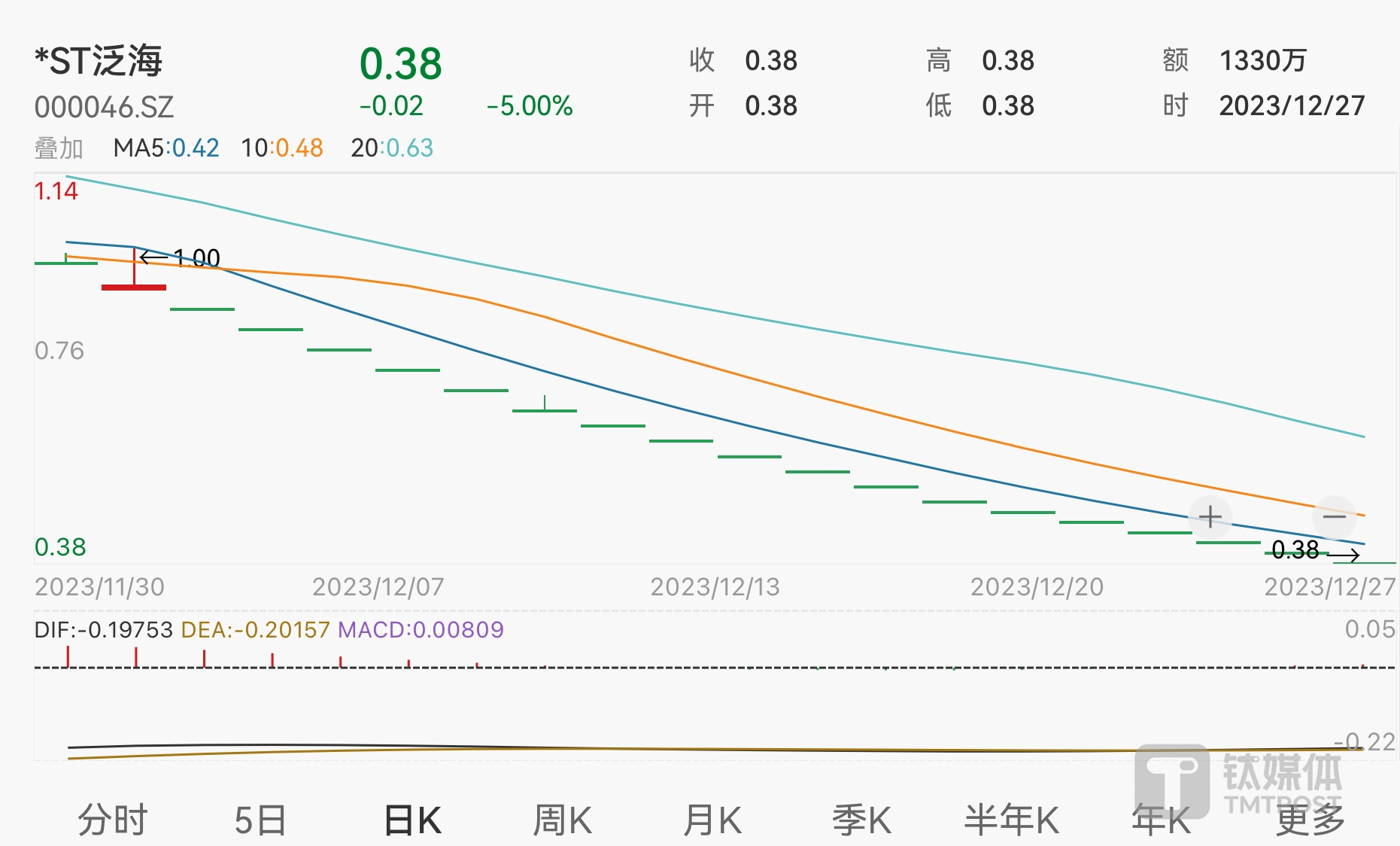 钛媒体APP注意到,由于在2023年11月30日至12月27日期间,公司股票连续二十个交易日的每日收盘价均低于1元,出发了股票终止上市的相关规定,*ST泛海已于2023年12月28日便停牌。