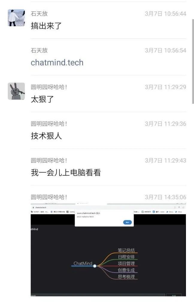 这一年的 Magic Moment,是 3 月 7 日 ChatMind 的诞生。前一天晚上在学校图书馆(石天放1999年生人,此时还没毕业),我看到北大一个团队做出了 ChatExcel ,就在想是不是还有什么形态的产品会出现,然后就把 GPT 能结合的所有信息格式(文本格式和文件格式)都梳理了一遍,发现思维导图这块国内外都没人做过,同时又是很好的可视化内容的形式。我先是把想法分享给了几个朋友,问他们要不要一起做,大家有的说已经晚了,有的人说没什么时间,我只能自己做,一个晚上就把它做出来了。