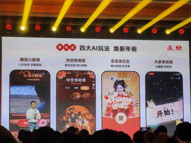 面向C端,支付宝在1月23日就宣布了要把2024年“集五福”将升级为“五福节”的计划,不仅将原先一个短周期的活动变成了一场“数字庙会”,还要推出飙戏小剧场、时空照相馆、会说话红包、大家来找福等四大AI新玩法。