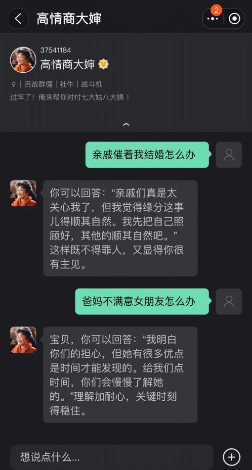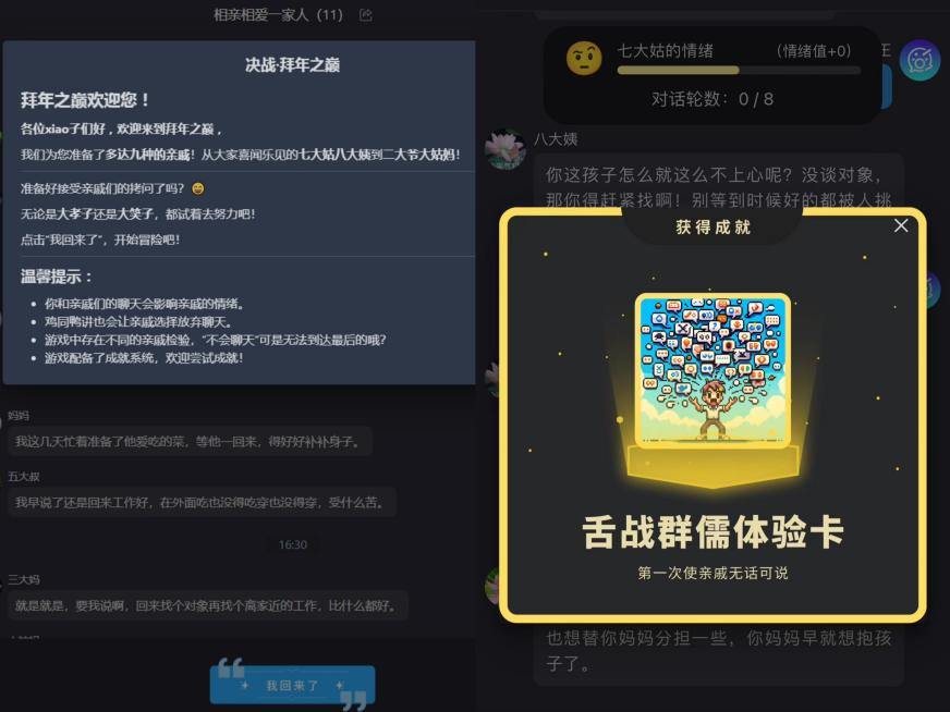身处于一个年轻人颇多的团队里,林昕更能感受到大家对AI赋能过后的春节,接受度到底有多高,“比如一些类似于‘回家过年模拟器’这样的AI应用,大家觉得吵赢了AI还是很有成就感的,那些年在七大姑八大姨的轮番询问下自己却讷讷不敢言的心理阴影好像也没那么大了。”林昕笑称,“因为这些产品的出现,可以让人收获更多的‘情绪价值’。”