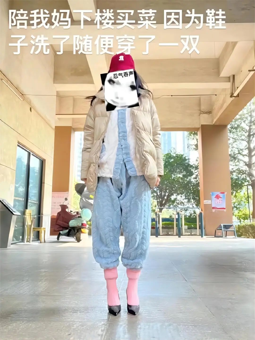 珊瑚绒睡裤或绣着大花的棉裤外穿,套住裤腿的棉袜搭配一双露脚面的高跟鞋或长筒靴;在长睡衣外穿上短羽绒服,与棉洞洞鞋或棉拖鞋一同出场;把一件件能穿上的衣服都套在身上,以至于外套里面是连帽卫衣,卫衣里面是针织外套,针织外套里面是毛衣,毛衣里面是打底衫,而下半身则是裙子里面是睡裤,睡裤里面是秋裤......