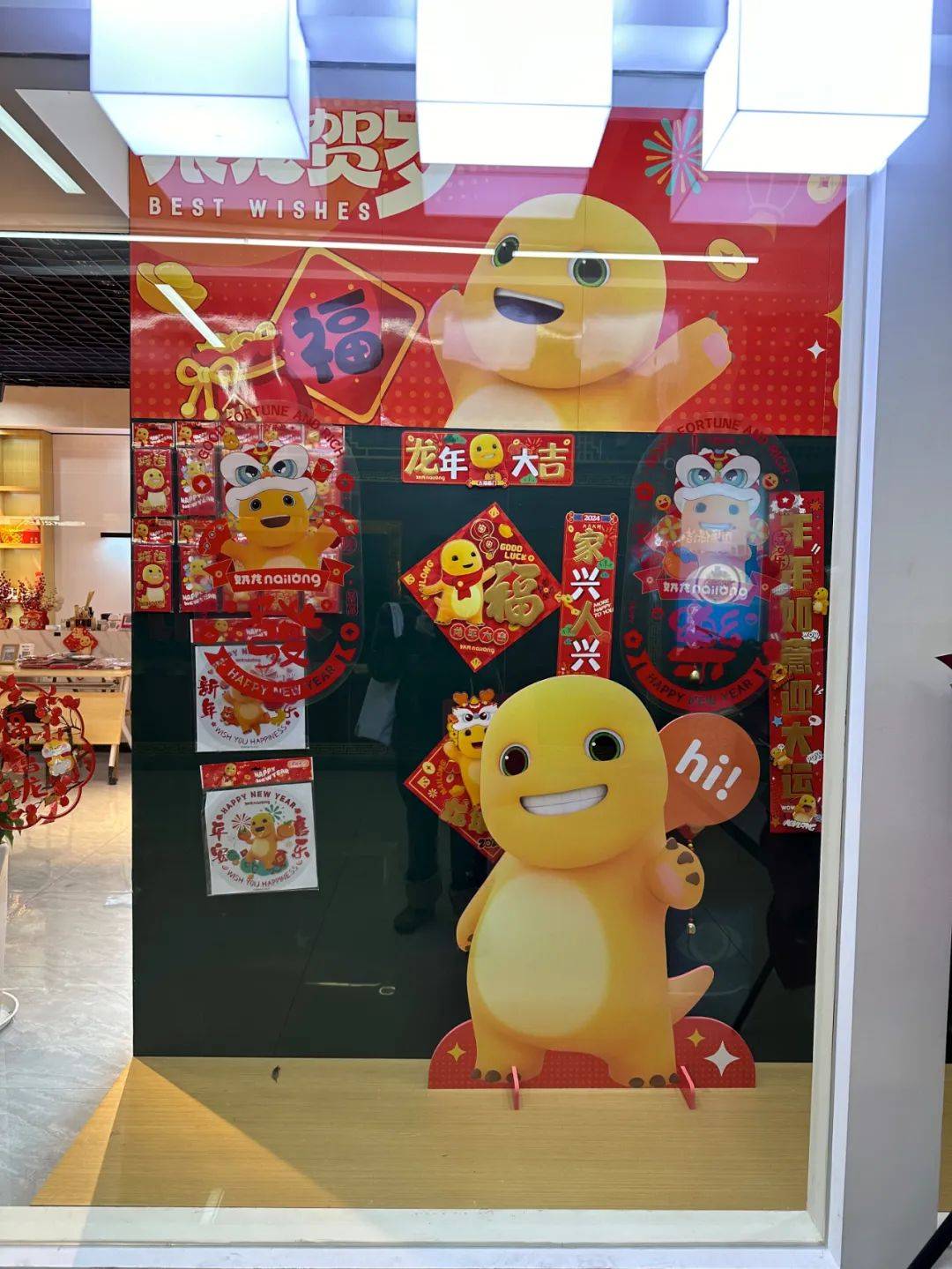 与以往任何一届生肖年一样,龙年也直接带火了一些IP,比如那条黄黄的“奶龙”。《天下网商》在义乌看到了一间IP授权店,店里销售着关于奶龙的各色年画。还有不少商家在创造自己的IP,例如有商家做出了巨幅卡通版“钱龙”作为店招吸引客商。