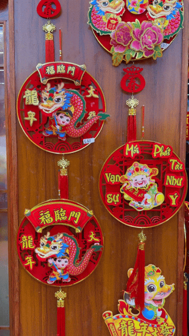 带着绒毛的立体小龙、嵌入越南文字的摇摆龙、像灯笼一样垂坠的长龙,还有奶龙IP的加入……大红色的氛围中,不同肤色的客商、不同国家的语言、不同地区的口音交织在一起。