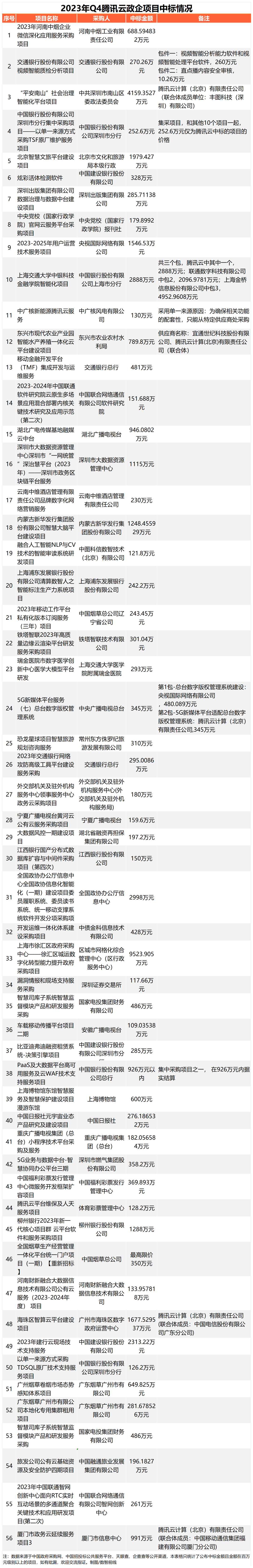 2023年Q4,金融为腾讯云贡献的项目数量占比超过了1/4,其中最大一单来自于“2023年建行云现场技术支持服务”项目,中标金额为2313.22万元。