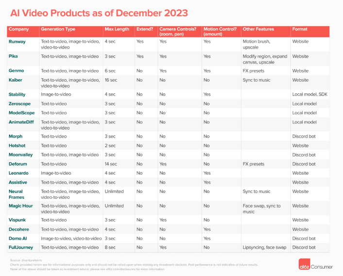 在Sora发布前,大众对文生视频方案并不陌生。根据知名投资机构a16z此前的统计,截至2024年底,市场上共有21个公开的AI视频模型,包括大众熟知的Runway、Pika、Genmo以及Stable Video Diffusion等等。