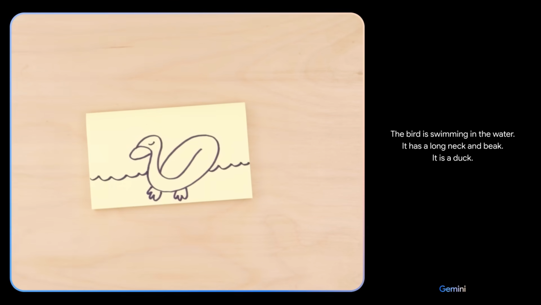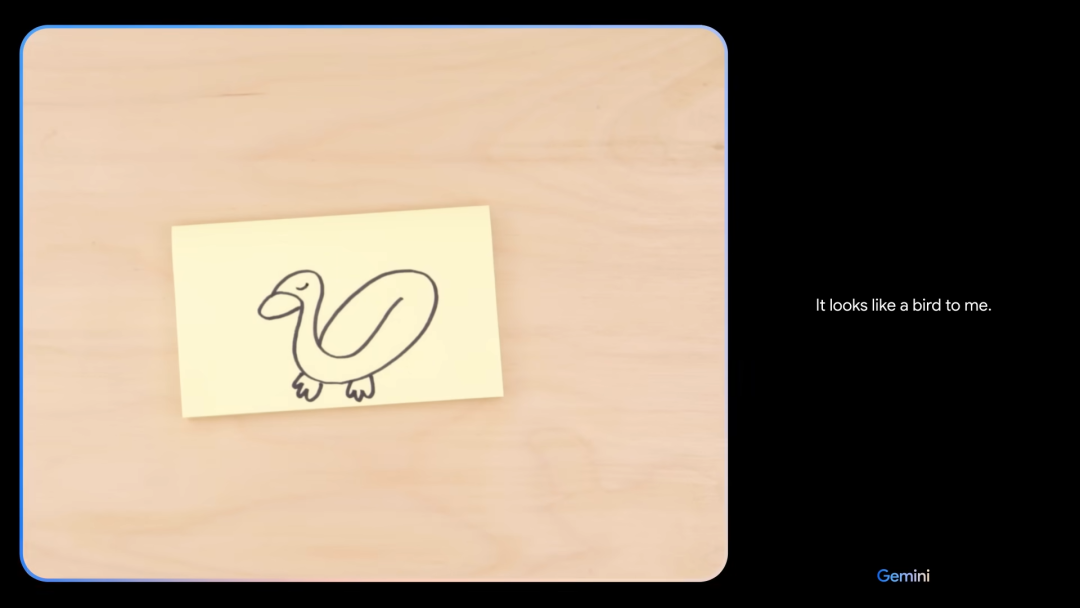 演示视频中,演示人员画了一个类似鸭子的轮廓让Gemini辨认,Gemini表示它觉得像个鸟。