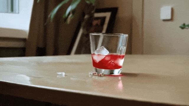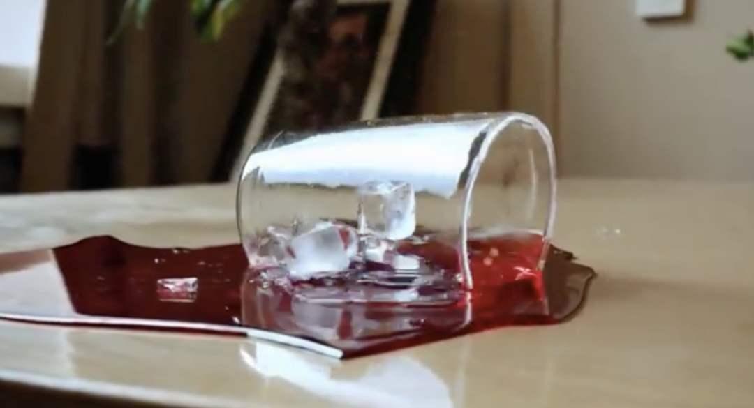 注意看,视频中的这个杯子莫名其妙的跳了起来并侧翻在桌面上,杯中的液体在杯子跳起来的一瞬间穿透了杯底铺满桌面,而最终杯子连同里面剩余的液体一起,融进了桌面。