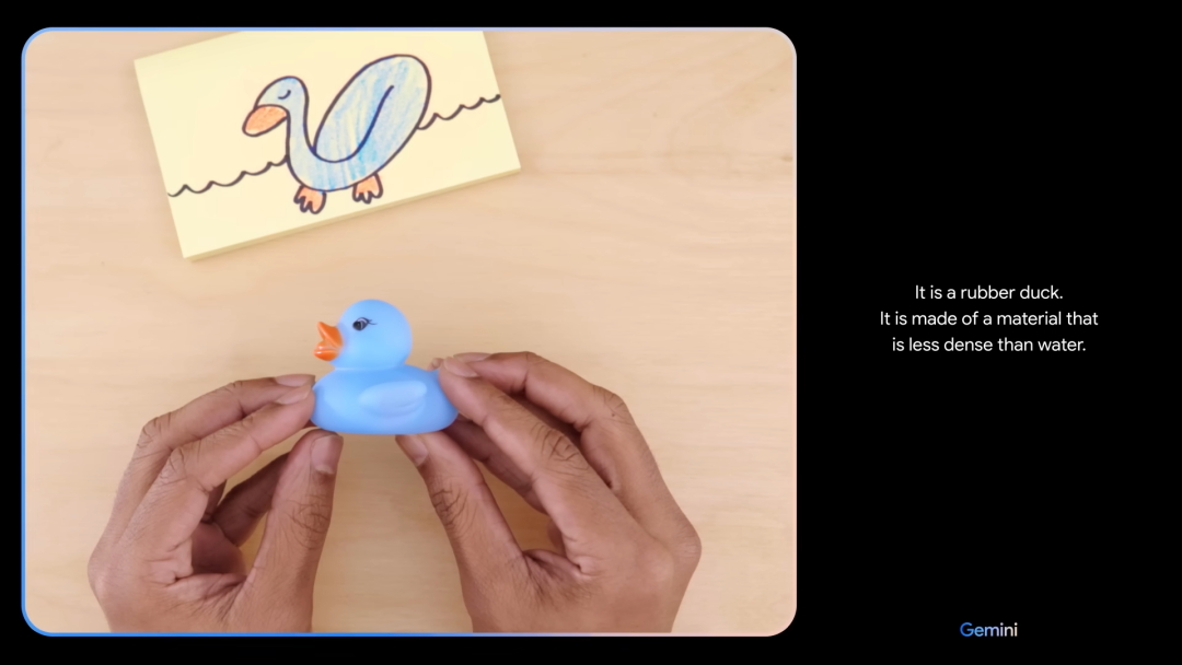 随后演示人员拿了个玩具小鸭子问Gemini这个东西是什么材质做的,Gemini表示看起来可能是橡胶也可能是塑料。而当演示人员捏响橡胶鸭子后,Gemini立刻判断出是用柔软的橡胶做成的。