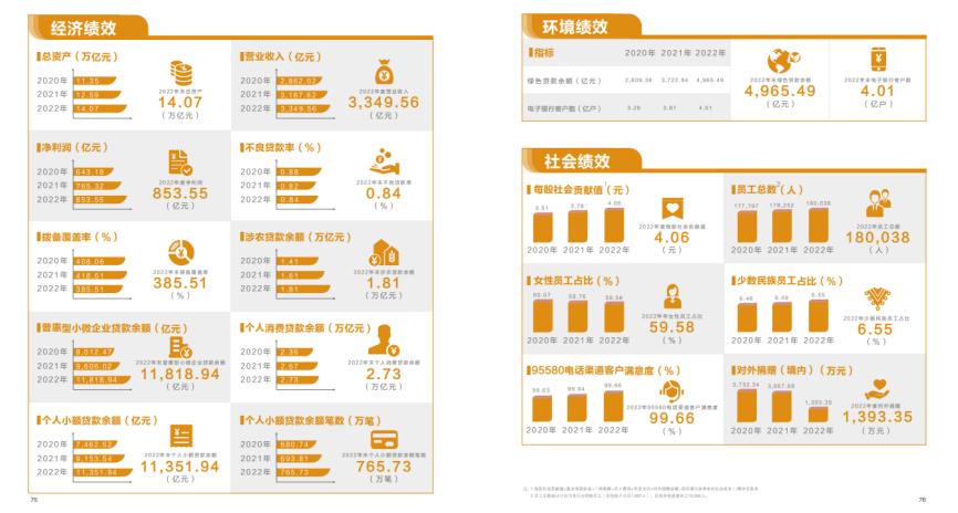 做出了特色的部分,是责任绩效表。与不少公司的ESG报告会在末尾提供关键ESG指标表现表格不同,邮储银行不仅提供了过去三年的经济绩效、环境绩效、社会绩效数据,还做出了一些可视化效果,给原本生硬的表格赋予了活泼气息,也方便读者快捷获取信息。