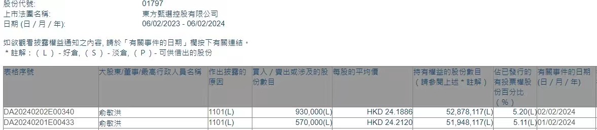 据2月5日港交所权益披露显示,2月1日至2日期间,东方甄选执行董事兼主席俞敏洪累计增持公司股份150万股,合计增持金额约3629.62万港元。
