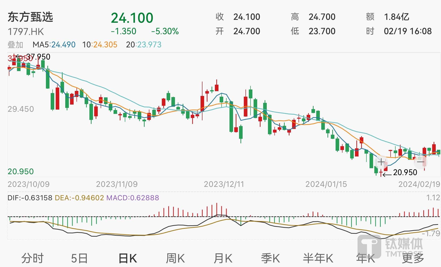二级市场方面,截至2月19日港股收盘,东方甄选股价报收24.1港元,跌幅为5.3%,成交额为1.84亿港元,当前公司总市值约245.02亿港元。![]()