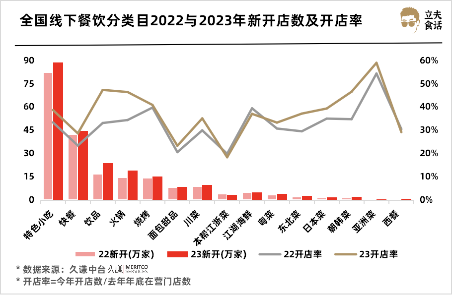 全国线下餐饮分类目22与23年新开店数及开店率