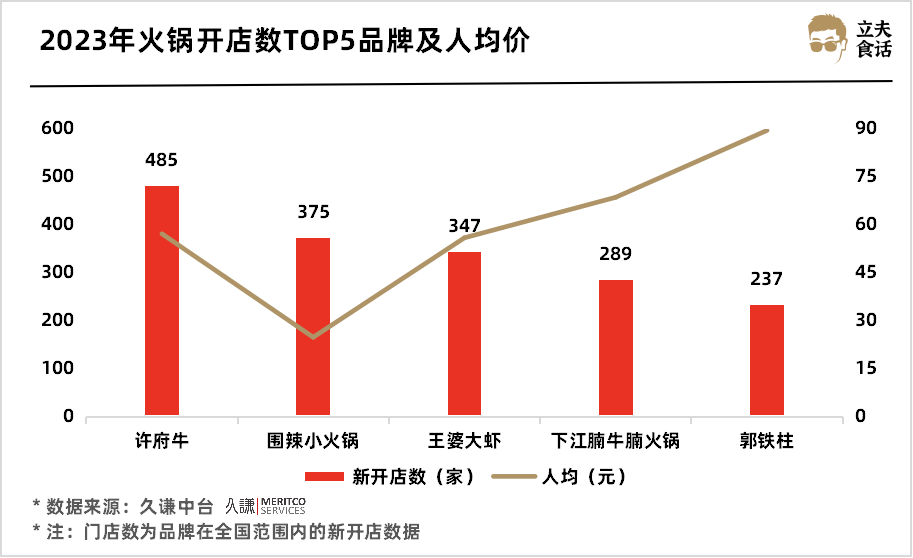 2023年火锅开店数TOP5品牌及人均价