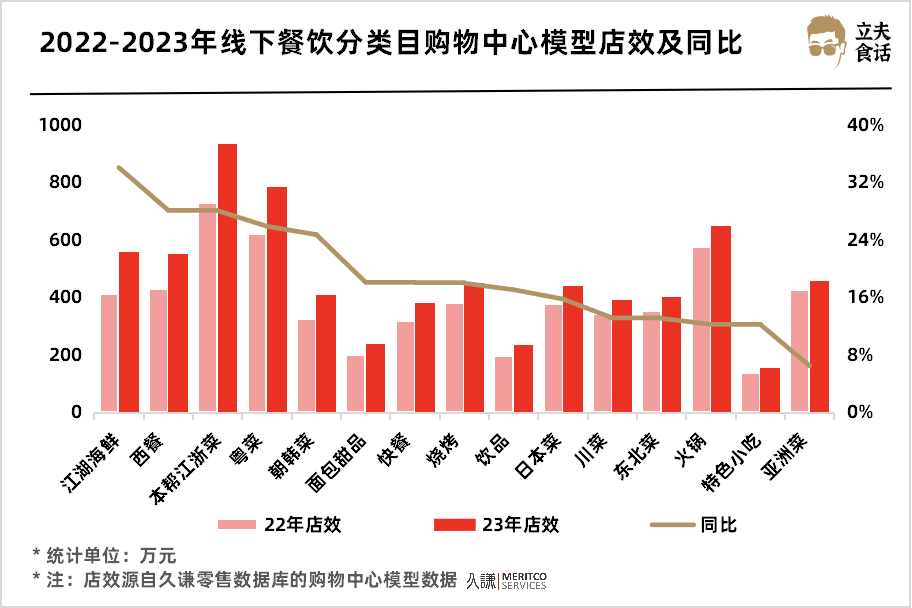 22-23年线下餐饮分类目购物中心模型店效及同比