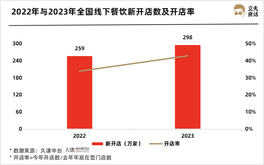 2023年全国新开餐饮门店数高达298万家,开店率达到43%。