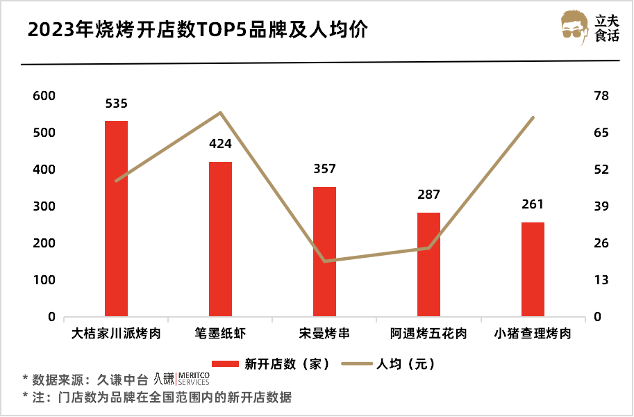 2023年烧烤开店数TOP5品牌及人均价
