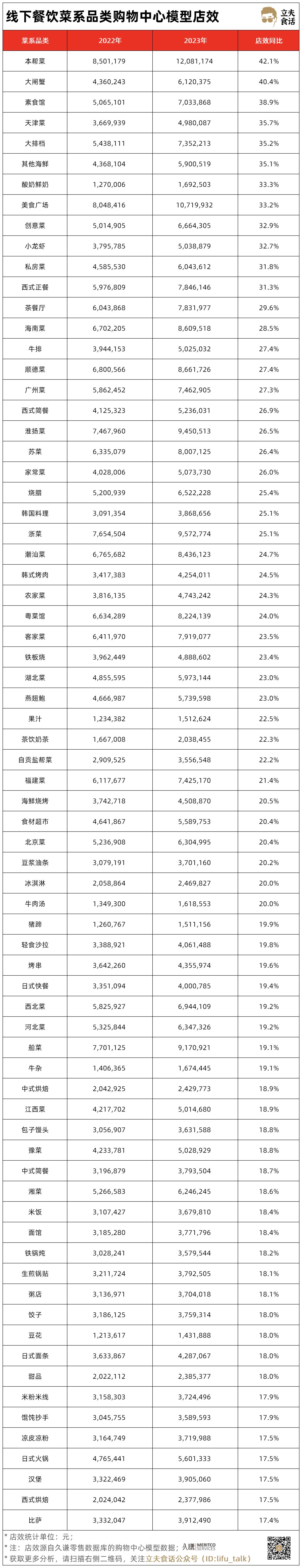 里面是2022与2023年购物中心餐饮的72个细分类目模型店效。