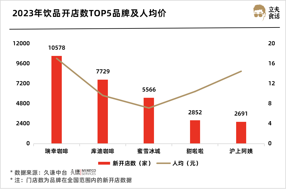 2023年饮品开店数TOP5品牌及人均价