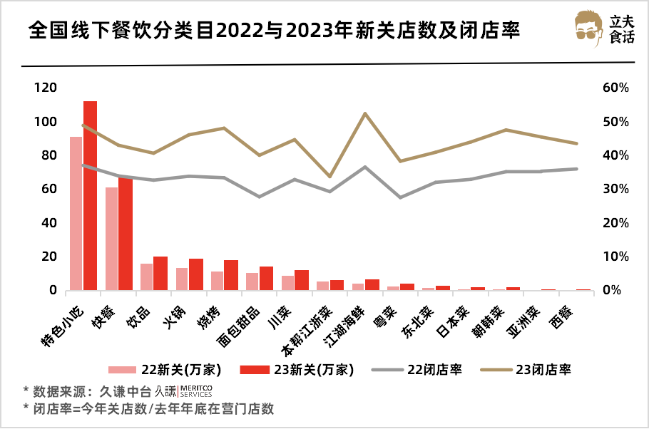 全国线下餐饮分类目22与23年新关店数及闭店率