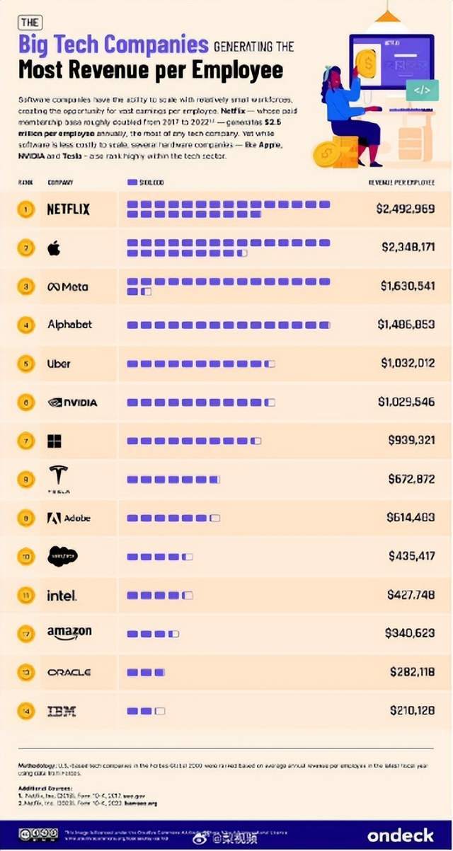 根据市场调查机构Ondeck公布的最新报告,在人均营收最多的全球科技公司中,Netflix以249万美元(约1785.3万元)位列第一。