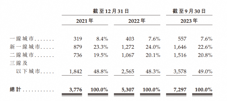在介绍自己的竞争力时,沪上阿姨强调自己在下沉市场的优势:“截至2023年9月30日,约49.0%的门店位于中国三线及以下城市。”但挡在这条路上的对手蜜雪冰城实力更为强劲,同一时期,蜜雪冰城在三线及以下城市门店就占据了总门店数的56.9%,仅9个月收入154亿元。