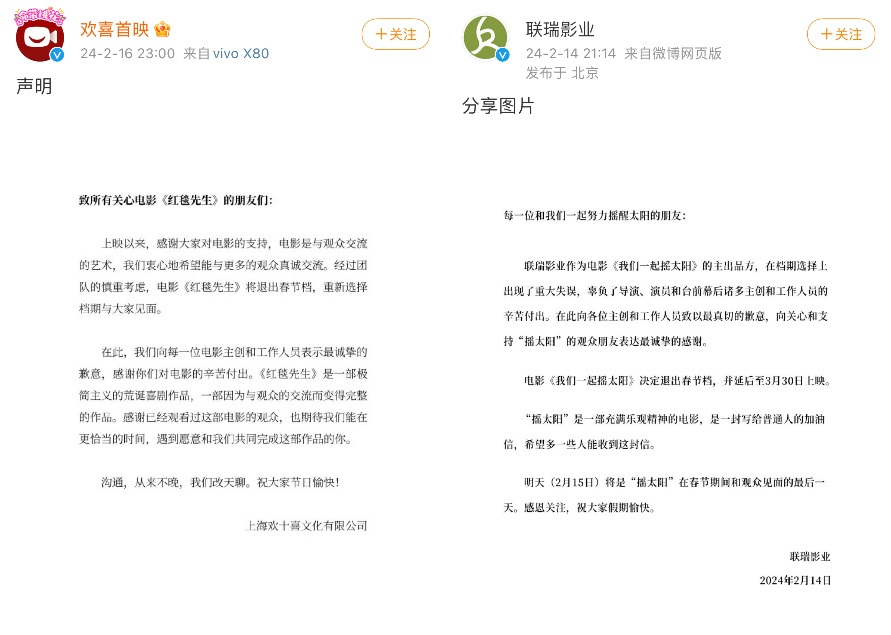 几家欢喜就有几家愁,春节档虽然容易拉高票房大盘,但也同样面临激烈竞争。春节档还未正式落幕之前,《我们一起摇太阳》、《红毯先生》、《黄貔:天降财神猫》《八戒之天蓬下界》四部电影就相继宣布退出春节档,后续上映时间未定。众所周知,因票房不佳而提前退档的影片即便之后重新上映,也很难获得更多新增票房。