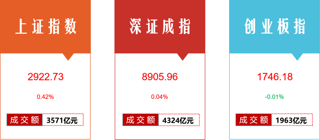 今日收盘,沪指报2922.73点,涨0.42%;深成指报8905.96点,涨0.04%;创业板指报1746.18点,跌0.01%。两市成交额7895亿元,较上一交易日大幅缩量1677亿元,超3500只个股上涨,两市再超百股涨停,目前已连续5日超百股涨停。今日,北上资金净流入17.27亿元、净卖出1.23亿元,其中沪股通净流入24.31亿元、净买入15.36亿元;深股通净流出7.04亿元、净卖出16.59亿元。