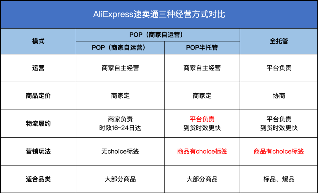 据速卖通介绍,目前平台有三种经营模式,分别为“POP”、“POP半托管”和“全托管”。