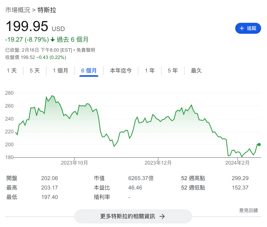 ▲图:特斯拉近6个月股价走势图