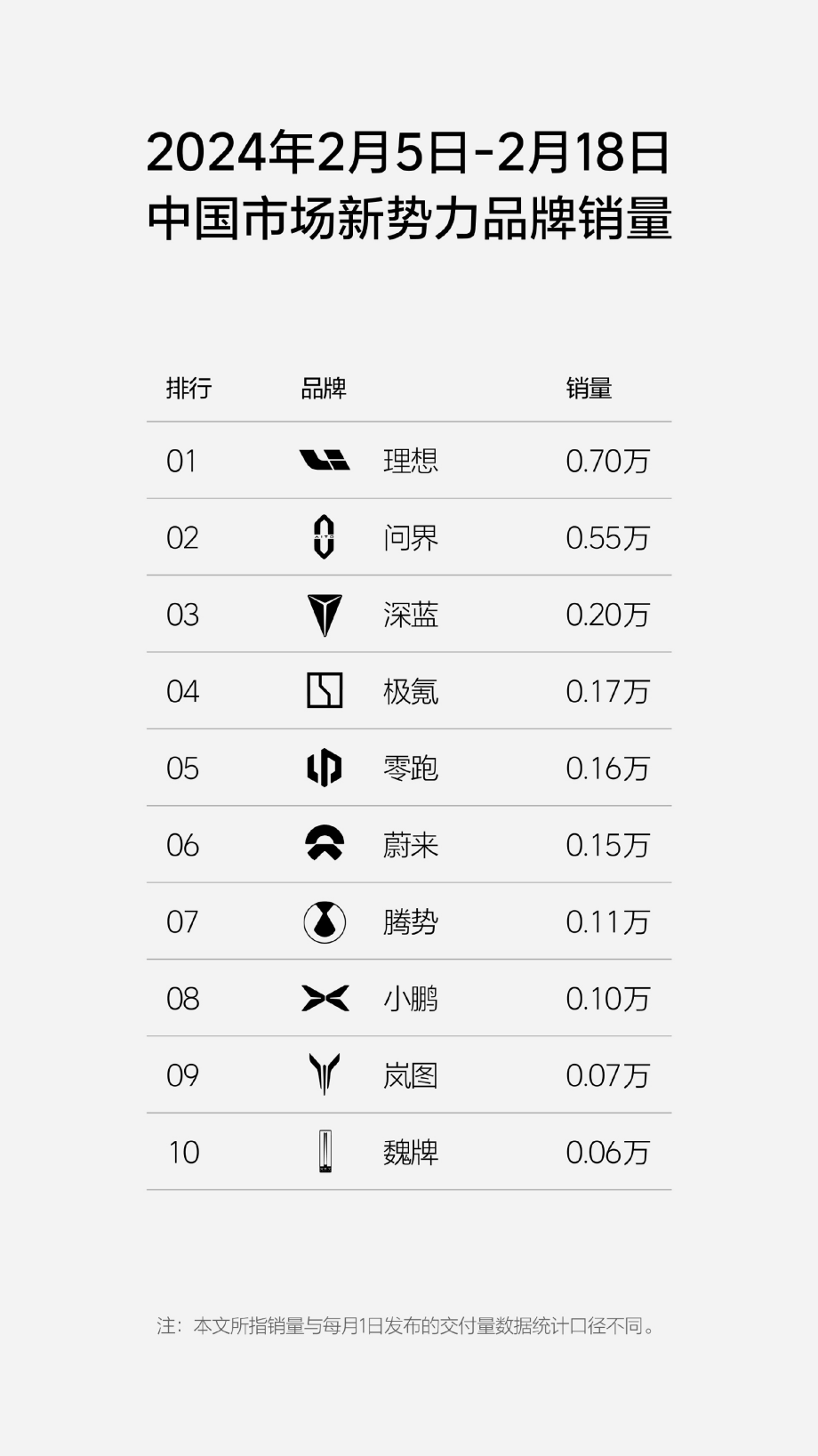 哪吒汽车或许更为艰难。2024年1月,哪吒的销量为10032辆,但它并未出现在2月5日-2月18日的排行榜单前十名里。值得一提的是,排名第十的魏牌,销量为600辆。