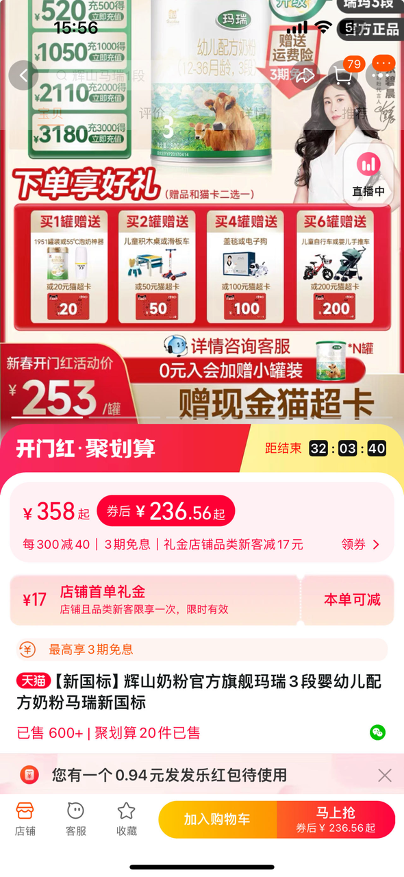 在辉山奶粉天猫旗舰店,新国标辉山玛瑞三段奶粉券后价为236元,但销量仅有600+。