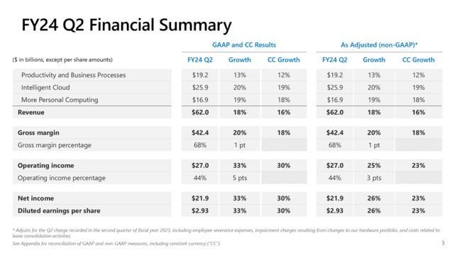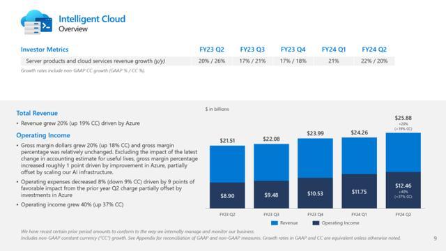 最新发布的2024财年第二季度财报显示,微软在人工智能领域的投入正逐步转化为可观的收益。财报显示,微软的营收和净利润均实现了双位数的增长。其中,智能云业务更是以20%的同比增长率领跑全场,毛利率高达72%。